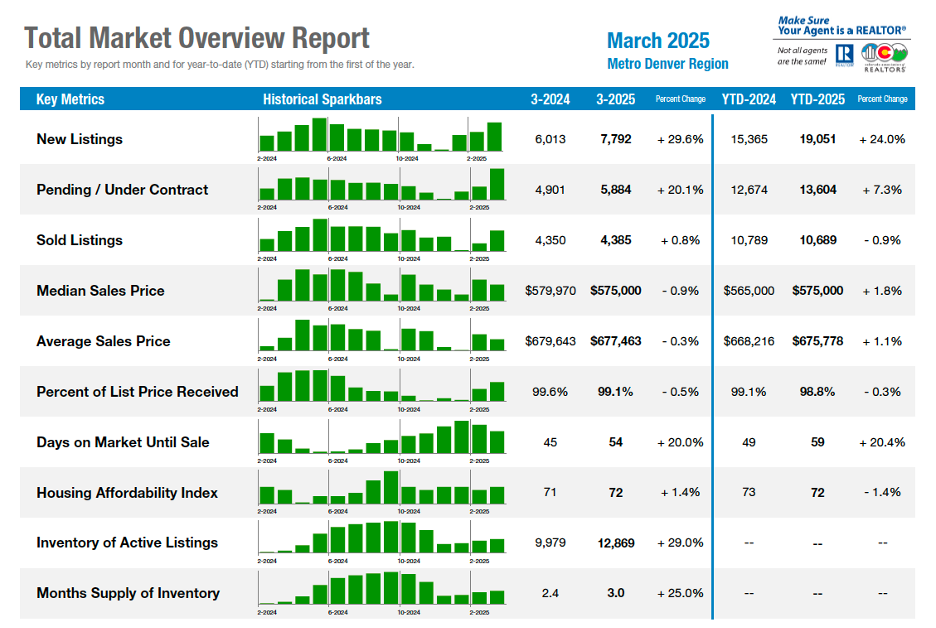 In the seven-county Denver-metro area, 7,790 new listings (5,733 single family/2,057 condo-townhome) hit the market, up nearly 30% from the same time last year. The more than 12,800 active listings across the Denver-metro area in March reflect a 29% increase over March 2024. Statewide, there were roughly 12,500 new listings (9,350 single family/3,131 condo-townhome) up 23.7% from a year prior and active listings rose just shy of 27% from a year prior with 23,213 in the inventory.