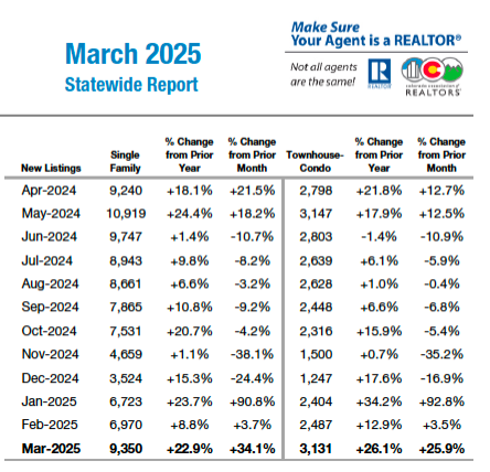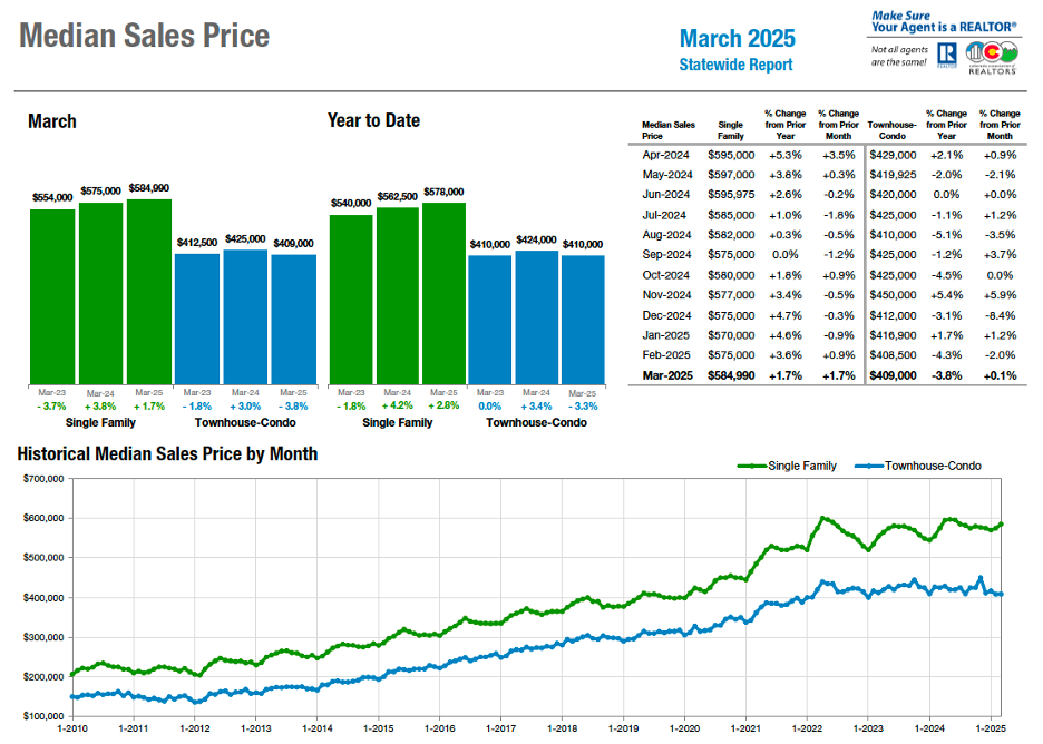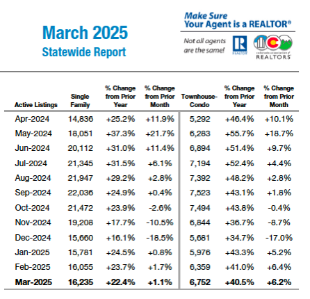 Statewide, the median price of a single-family home hit $584,990, a 1.7% bump in the past 30 days, as well as compared to March 2024. For the condo-townhome market, pricing ticked up 0.1% from February to March however, the $409,000 median is down 3.8% from a year ago.
