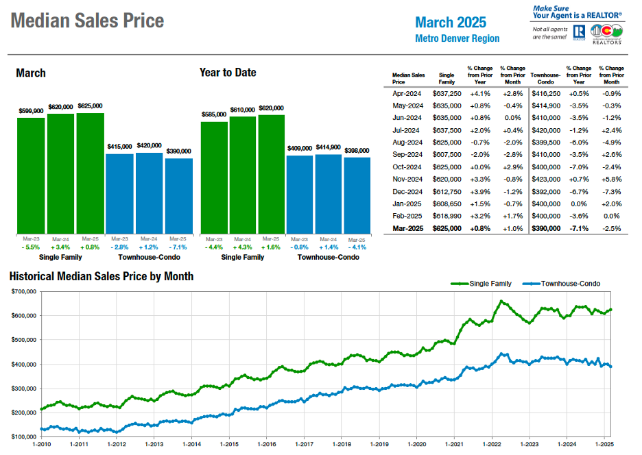 Looking to median sales price, single-family homes in the seven-county Denver area ticked up just 1% from February to March at $625,000 which is also up just less than 1% from a year ago. Condo-townhome median price fell 2.5% from February to March and is down more than 7% from a year prior at $390,000.
