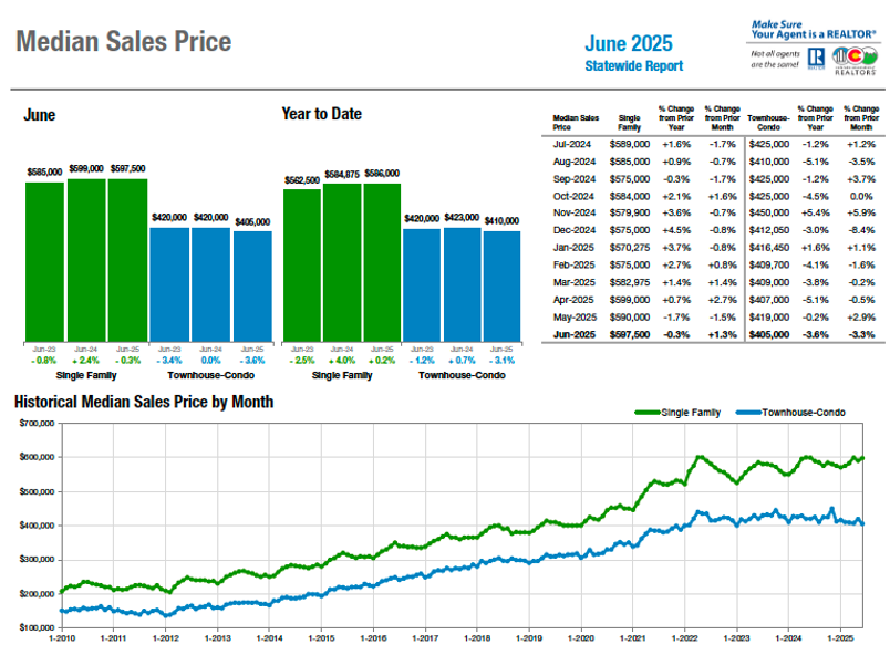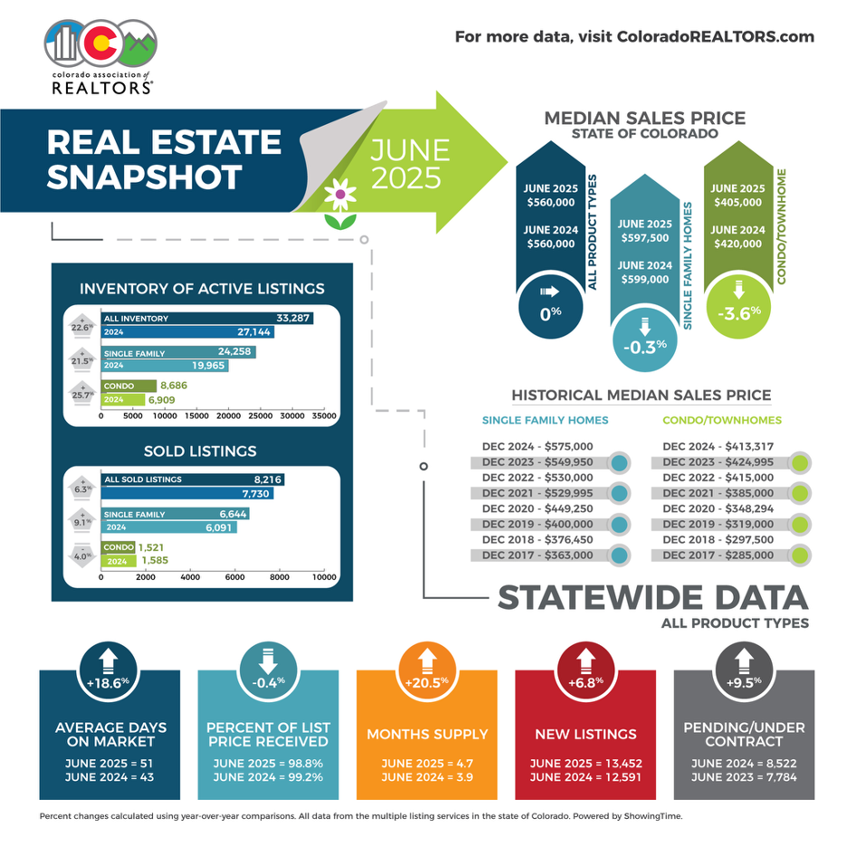 The Colorado Association of REALTORS® Monthly Market Statistical Reports are prepared by Showing Time, a leading showing software and market stats service provider to the residential real estate industry and are based upon data provided by Multiple Listing Services (MLS) in Colorado. The June 2025 reports represent all MLS-listed residential real estate transactions in the state. The metrics do not include “For Sale by Owner” transactions or all new construction. CAR’s Housing Affordability Index, a measure of how affordable a region’s housing is to its consumers, is based on interest rates, median sales prices and median income by county.