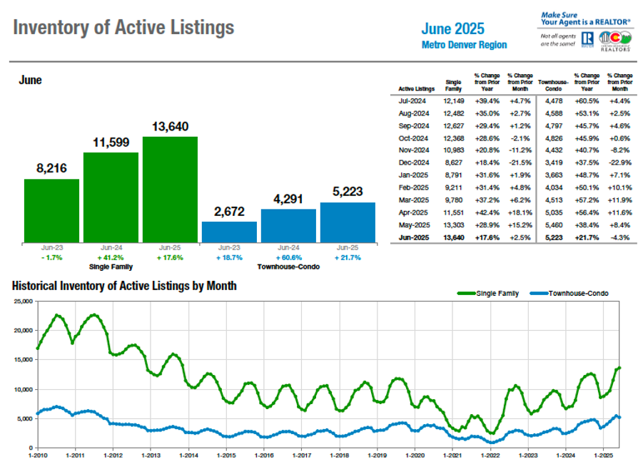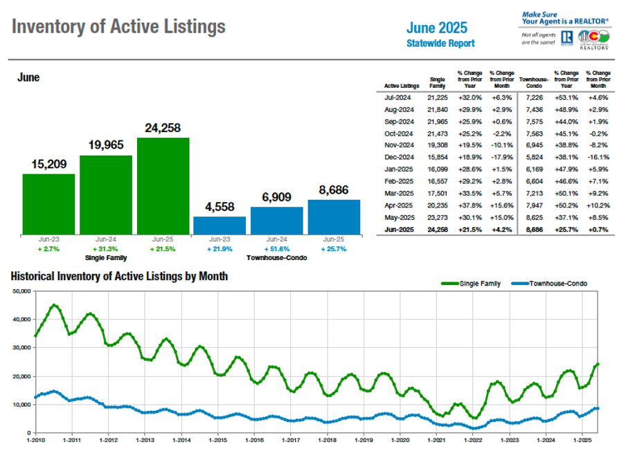Sellers pumped the brakes a bit in June with new listings for single-family homes falling 13.8% and condos down more than 20% in the seven-county Denver metro area from May. Statewide, single-family new listings fell 11.2% while condo new listings were off 14.2% from the prior month. Despite the easing in new listings, inventory of active listings jumped to 18,870 in the seven-county Denver area, an 18.7% increase from a year ago while statewide, active listings reached 33,287 in June, up 22.6% from June 2024 thanks to a slowdown in closings across the metro area and state and reflecting continued caution from buyers still facing higher interest rates and overall affordability challenges.