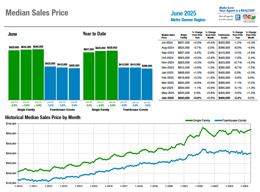 For the fourth straight month, and seemingly unfazed by the large volume of active inventory, median pricing for single-family homes in the seven-county Denver area ticked up 0.8% in June and is up exactly the same 0.8% from a year prior at $640,000. Condo/townhome median pricing remained flat for the month comparison at $400,000 but is down 2.4% from June 2024. Statewide, the median price of a single-family home rose 1.3% in June to $597,500, down just 0.3% from a year prior. Condo-townhome median pricing fell 3.3% from May to June and is down 3.6% from a year ago at $405,000.