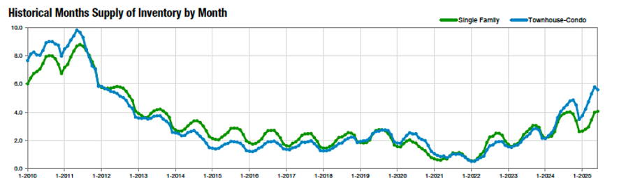 “An analysis of the single-family and patio homes’ statistics for Colorado Springs in June 2025 raises a proverbial question: “Is the glass half empty or half full?” Since 2015, low inventory has posed the most significant challenge in our real estate market. In June 2015, the supply was a meager 2.3 months. This downward trend continued, reaching an alarmingly low 0.4-month supply in June 2021. However, an improving trend began at a snail’s pace. Last month, with 4,055 active listings and 1,197 sales, the supply rose to 3.4 months, moving closer to a more desirable range of 4 to 6 months.