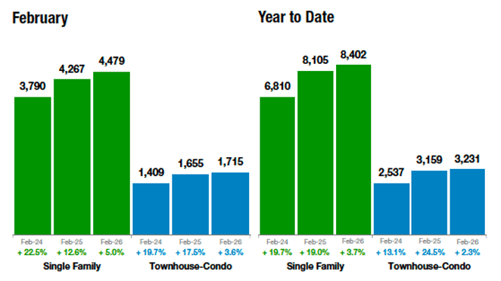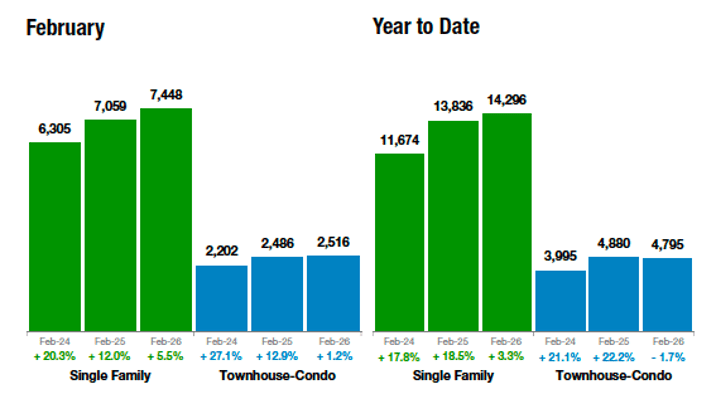 February delivered an uptick in activity with home sales rising 4.1% year over year, though the broader market remains mixed. Home values declined 2.4%, inventory increased 12.1% and days on market rose for both single-family homes and townhomes, signaling softer pricing and more choices for buyers. Lower interest rates are helping support demand and builders are offering strong incentives. However, economic uncertainty, including a softening job market, rising debt levels, and global instability continues to create caution as the housing market moves through the year.