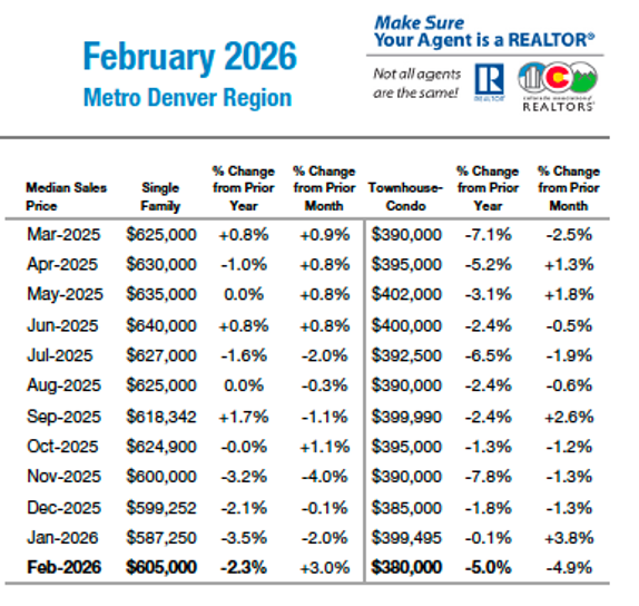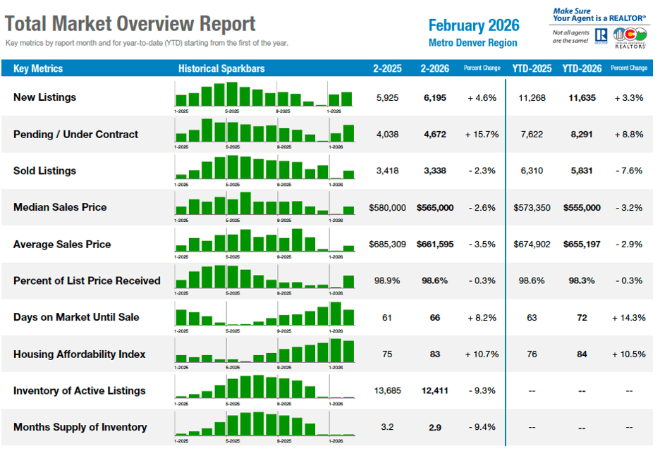 Denver Metro – The market showed stronger buyer engagement in February with new listings up 4.6% and pending contracts rising 15.7%, signaling improving demand even as closed sales dipped slightly. The median price fell 2.6% year over year to $565,000, and homes averaged 66 days on the market, reflecting a more negotiated environment. Single-family homes continue to lead activity, while condos and townhomes lag due to affordability pressures. With interest rates above 6% and economic uncertainty rising, realistic pricing and patience remain key.