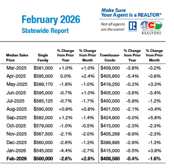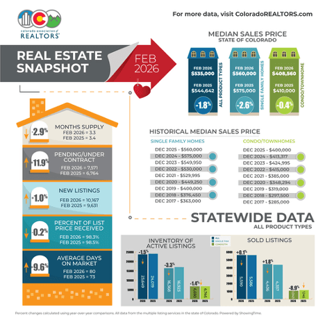 The Colorado Association of REALTORS® Monthly Market Statistical Reports are prepared by Showing Time, a leading showing software and market stats service provider to the residential real estate industry and are based upon data provided by Multiple Listing Services (MLS) in Colorado. The February 2026 reports represent all MLS-listed residential real estate transactions in the state. The metrics do not include “For Sale by Owner” transactions or all new construction. CAR’s Housing Affordability Index, a measure of how affordable a region’s housing is to its consumers, is based on interest rates, median sales prices and median income by county.